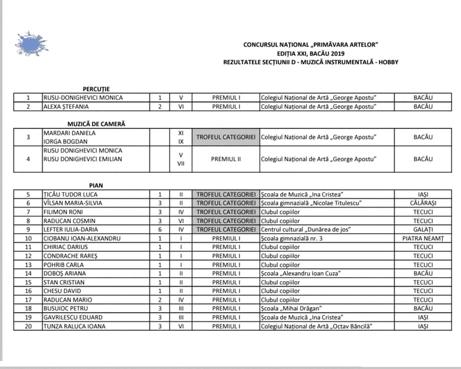 Astfel,Trofeele, in majoritatea lor, au fost disputate de catre elevii Colegiului National de Arta George Apostu .