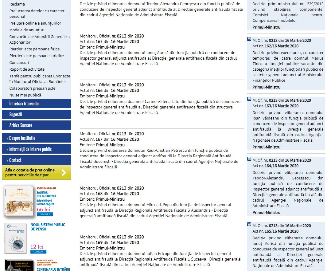 Imediat după publicarea în Monitorul Oficial a Decretului privind declararea Stării de Urgență, au fost publicate mai multe decizii ale premierului Ludovic Orban, prin care au fost destituiți din funcții șefii Direcției generale antifraudă fiscală din cadrul Agenției Naționale de Administrare Fiscală.