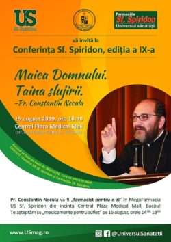 Oferta unică este întregită de conferințe și evenimente dedicate sănătății, susținute de medici specialiști și „doctori pentru suflet”, astfel, în data de 15 august 2019, ora 18:30, megafarmacia US Sf. Spiridon împreună cu lanțul de Farmacii Sf. Spiridon oferă în dar băcăuanilor un nou eveniment ce îl are ca invitat special pe mult îndrăgitul părinte Constantin Necula. Tema conferinței este „Maica Domnului. Taina slujirii.”