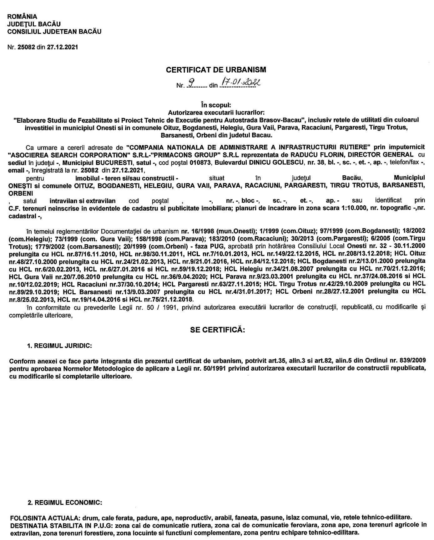 Consiliul Județean a eliberat astăzi certificatul de urbanism pentru executarea lucrărilor „Elaborare Studiu de Fezabilitate și Proiect Tehnic de Execuție pentru Autostrada Brașov- Bacău ”, inclusiv rețele de utilități, din culoarul pe care îl va traversa această investiție- A13.