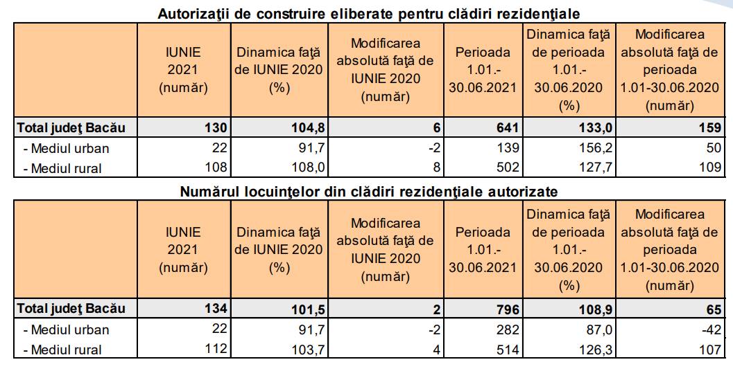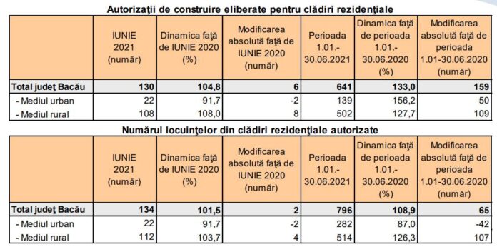 Conform InfoStat, comparativ cu perioada 1.01.-30.06.2020, numărul acestora a crescut cu 159 de autorizaţii, respectiv cu +33,0%.Numărul de locuinţe din clădirile rezidenţiale pentru care s-au eliberat autorizaţii de către administraţiile locale la nivelul judeţului Bacău au fost în luna IUNIE 2021 în număr de 134 (16,4% în mediul urban şi 83,6% în mediul rural), în creștere cu 2 autorizaţii, respectiv +1,5% faţă de luna IUNIE 2020 şi în creștere cu 4 locuinţe, respectiv cu +3,1% faţă de luna MAI 2021. În perioada 1.01.-30.06.2021 numărul locuinţelor din clădirile rezidenţiale a fost de 796, din care 282 în mediul urban (35,4%) şi 514 în mediul rural (64,6%). Comparativ cu perioada 1.01.-30.06.2020, numărul acestora a crescut cu 65 locuinţe, respectiv cu +8,9%.