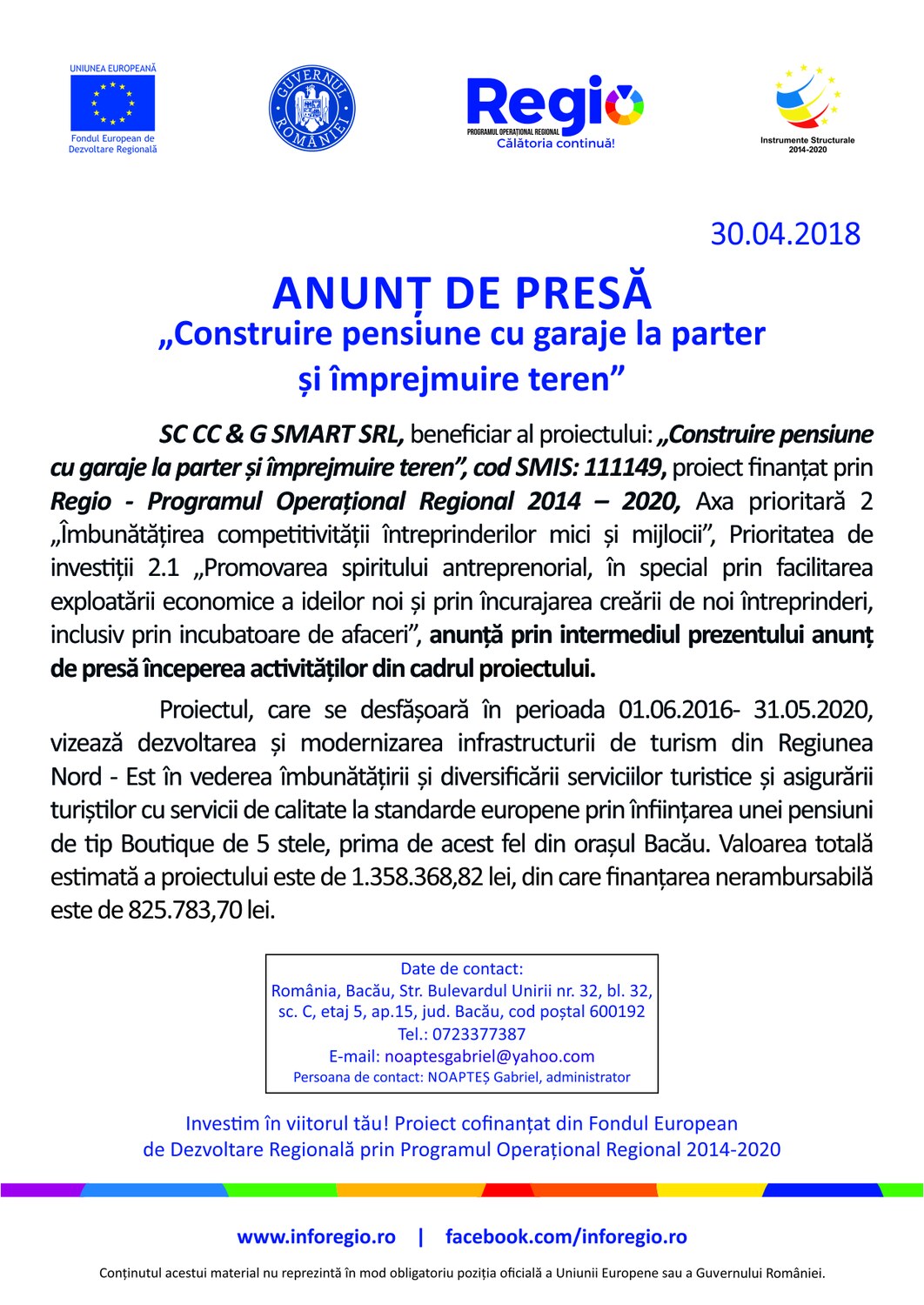 Comunicat de presăConstruire pensiune cu garaje la parter și împrejmuire teren SC CC & G SMART SRLde Comunicat de presa - 26 aprilie 2018AcțiuneFacebookTwitterWhatsAppTelegramVK