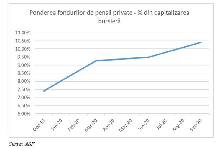 În ceea ce privește contribuția la piața de capital din România se observă o creștere constantă a deținerilor fondurilor de pensii private în ponderea capitalizării bursiere, așa cum este redat în graficul de mai jos (s-au avut în vedere deținerile directe în emitenți locali).