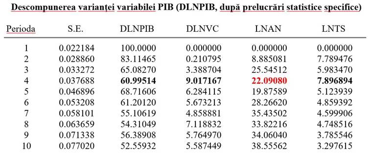 Utilizând un model VECM de descompunere a variantei PIB în funcție de valoarea contribuțiilor la fondurile de pensii Pilonul 2, a activelor nete și a valorii titlurilor de stat aflate în portofoliilor acestor fonduri, se constată că variabila active nete are o influență semnificativă (de peste 22% cu un lag optim de 4 trimestre) asupra variabilității dezvoltării economice.