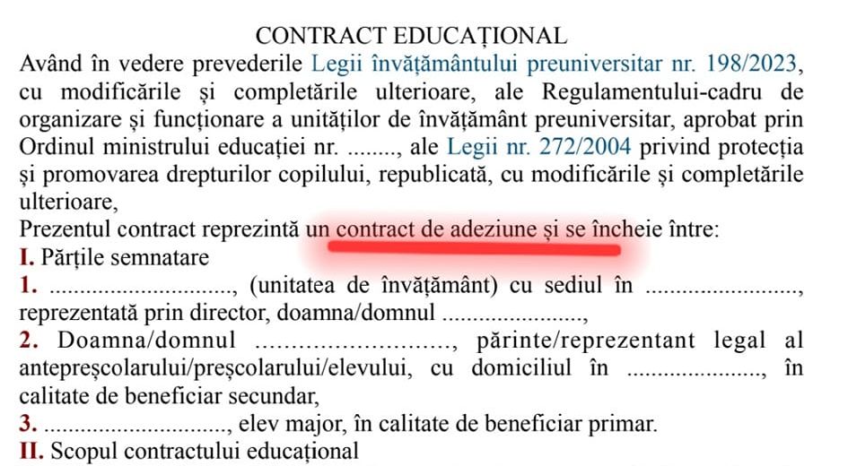 Un aspect esențial ridicat de critici este faptul că acest contract este unul de adeziune, adică un document cu clauze impuse de stat, pe care părinții nu au posibilitatea să le negocieze. Conform articolului 1.175 din Noul Cod Civil, un contract de adeziune este un acord în care clauzele esențiale sunt redactate și impuse de una dintre părți, cealaltă fiind obligată să le accepte fără modificări. În cazul de față, statul joacă rolul părții impunătoare, iar părinții nu au decât să semneze.