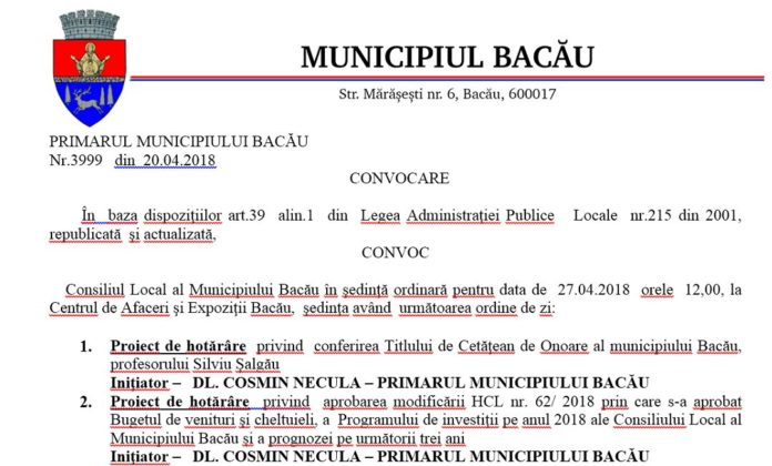 1. Proiect de hotărâre privind conferirea Titlului de Cetăţean de Onoare al municipiului Bacău, profesorului Silviu Șalgău