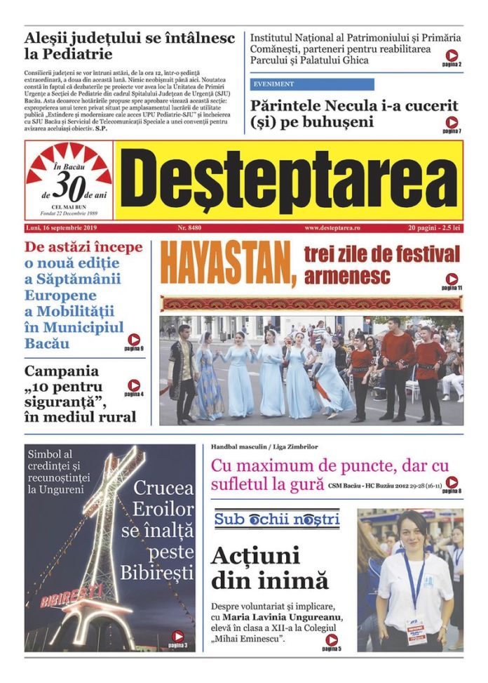 Coperta 1 Deșteptarea16 septembrie 2019AcțiuneFacebookTwitterWhatsAppTelegramVK AcțiuneFacebookTwitterWhatsAppTelegramVK Sărbători la Centrul de Zi „Clubul Pensionarilor”Fotbal/ Liga 2: FC Bacău pregătește ultimul meci al anului: derby-ul cu CeahlăulS-a deschis Atletic Park. Cum aratăIncendiu la o locuință din Slănic MoldovaCum alegi pensulele de machiaj și produsele care completează rutina perfectăVolei: Turneu internațional de old-boys la Sala Sporturilor „Narcisa Lecușanu”Rolul unui stil de viață activ și al vitaminelorȘi școala poate fi numită acasăOnești: Spitalul Municipal introduce aparatură de nivel universitar pentru proceduri gastroenterologice avansateZilele libere legale în 2026: ce program vor avea salariații româniSe deschide Athletic Park Bacău – un nou reper sportiv pentru comunitateActivitățile ISU Bacău în noiembrie: pregătirea și reziliența comunităților