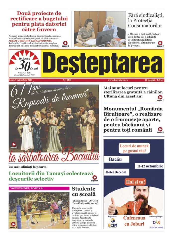 Coperta 1 Deșteptarea7 octombrie 2019AcțiuneFacebookTwitterWhatsAppTelegramVK AcțiuneFacebookTwitterWhatsAppTelegramVK Exercițiu de evacuare și prim ajutor la Spitalul Județean de Urgență Bacău, simulând un cutremur în zona VranceaSpitalul „Prof. Dr. Eduard Apetrei” Buhuși deschide dialogul cu pacienții, într-o întâlnire programată pe 23 decembrieDouă dintre cele mai valoroase companii din România sunt din Bacău, conform Ziarului FinanciarBacău: Universitatea „Vasile Alecsandri” a organizat serbarea de CrăciunDublă lansare de carte la Centrul de Cultură „George Apostu”, cu Carmen Mihalache și Dan PerșaCreștere a infecțiilor respiratorii în județul Bacău. Opt cazuri noi de gripă în ultima săptămânăPesta porcină africană confirmată la IteștiPompierii au verificat adăposturile antiaeriene. Doar 6% din populația județului încape în eleBurnout-ul de sărbători. De ce nu ne simțim mai bine după vacanță, ci mai obosiți„Genealogii imaginare”. Expoziție de sculptură Marian PetreIntervenție chirurgicală minim invazivă de excepție, realizată la Secția de Chirurgie și Ortopedie Pediatrică a SJU BacăuFotbal/ Liga 3: Etapă de final de an