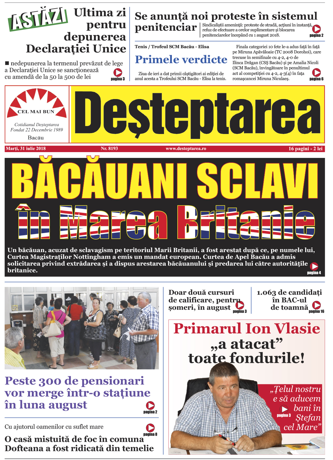 Coperta 1 Deșteptarea 31 iulie 2018 Acțiune FacebookTwitterWhatsAppTelegramVK Acțiune FacebookTwitterWhatsAppTelegramVK Efectele digitalizării raportărilor fiscale se lasă așteptate – TVA neîncasată, din nou în creștere Drumul Expres Bacău–Piatra Neamț face un pas decisiv: constructor desemnat pentru proiectul așteptat de ani de zile Șah: Cupa de Crăciun a ajuns la ediția cu numărul șapte Incendiu la un apartament în Bacău Braconaj la Itești: mistreț împușcat ilegal Ultima apariție a ziarului „Steagul roșu” – 16 decembrie 1989 Reges-Online devine obligatoriu de la 1 ianuarie 2026. Ultimele zile pentru migrarea din Revisal Gala Performanței Sportive: gratitudine pentru 2025, motivație pentru 2026 Gala Educației – 1.000 de laureați din Educația Băcăuană, recompensați pentru excelență Captură importantă de materiale pirotehnice în comuna Sărata Pâna la finele anului, Autostrada A7 se va deschide traficului până la Adjud Despre provocările actuale şi aboradrea lor prin cercetare şi inovare, în cadrul proiectului Connect-UBc al Universităţii „Vasile Alecsandri” din Bacău