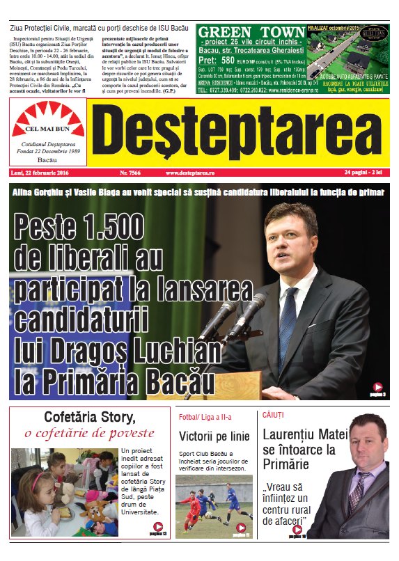 Coperta Deșteptarea 21 februarie 2016 Acțiune FacebookTwitterWhatsAppTelegramVK Acțiune FacebookTwitterWhatsAppTelegramVK Peste 30 de intervenții gestionate de pompierii băcăuani în acest weekend Rezultatele finale ale Concursului Interdisciplinar „Vrănceanu – Procopiu” Bacău, ediția a XXIV-a, 2025 Fotbal: Ne-a părăsit Ioan Sdrobiș! Insula Misterioasă la balul Bobocilor de la Liceul Teoretic „Henri Coandă” Bacău Ziua Internațională a Voluntariatului celebrată prin concurs de mediu la Palatul Copiilor Bacău U17 FC Viitorul Onești, calificare dramatică în optimile Cupei României Obținerea permisului de conducere, mai simplă: cazierul judiciar este verificat direct la ghișeu Avertisment dur de la Garda de Mediu Bacău: un operator economic din Ardeoani, sancționat drastic pentru poluare Jandarmii băcăuani i-au adus căldură lui Nea Vasile, 74 de ani Fotbal/ Liga 3: Viitorul Onești câștigă, FC Bacău 2 încheie la egalitate un meci dramatic, iar Aerostar pierde acasă Clubul Sportiv Bronx, rezultate remarcabile la competiția din Houlegate, Franța Conferința „Excelență, inovație și performanță în medicină” – un eveniment de referință pentru comunitatea medicală băcăuană