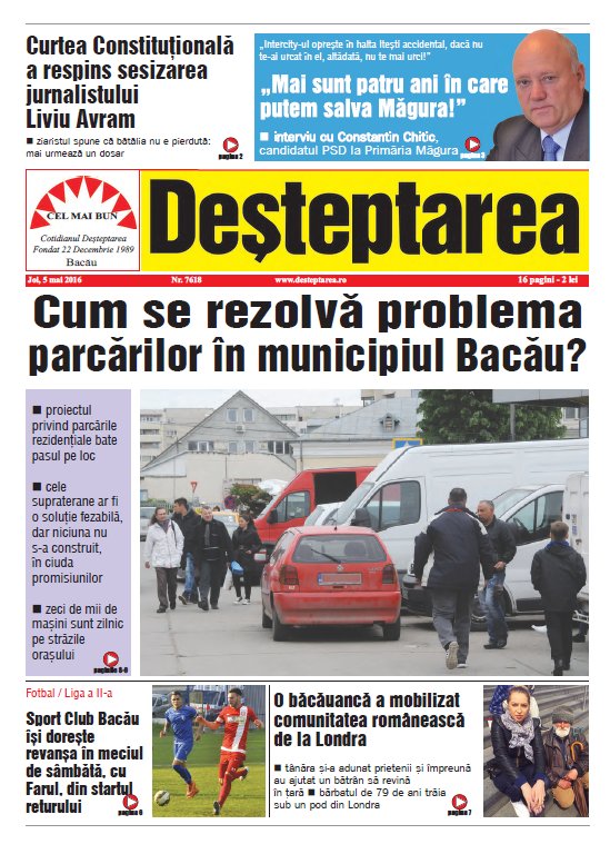Coperta Deșteptarea 4 mai 2016 Acțiune FacebookTwitterWhatsAppTelegramVK Acțiune FacebookTwitterWhatsAppTelegramVK Jandarmii băcăuani i-au adus căldură lui Nea Vasile, 74 de ani Fotbal/ Liga 3: Viitorul Onești câștigă, FC Bacău 2 încheie la egalitate un meci dramatic, iar Aerostar pierde acasă Clubul Sportiv Bronx, rezultate remarcabile la competiția din Houlegate, Franța Conferința „Excelență, inovație și performanță în medicină” – un eveniment de referință pentru comunitatea medicală băcăuană Sub semnul recunoștinței și al binelui comun la hramul bisericii „Sfântul Nicolae” din Bacău Elevi ai Liceului Tehnologic Târgu Ocna, în recital la „Sunetul colindelor în inima muntelui de sare” Spitalul din Buhuși va deschide în 2026 un program de chirurgie robotică – un pas major pentru medicina din nord-estul țării Când Cel Drept vindecă gârbovirea celei smerite (Luca 13, 10- 17) Duminica a II din Advent Acțiunea Conservatoare Bacău a constituit organizația locală Onești Informare privind cele mai bune practici de utilizare a produselor biocide Decembrie 2025 Moș Nicolae a venit și la copiii internați la „Pediatrie”