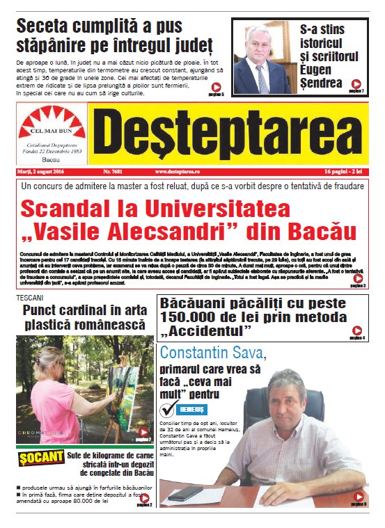 Coperta Deșteptarea 1 august 2016 Acțiune FacebookTwitterWhatsAppTelegramVK Acțiune FacebookTwitterWhatsAppTelegramVK Fotbal/ Liga 3: Viitorul Onești câștigă, FC Bacău 2 încheie la egalitate un meci dramatic, iar Aerostar pierde acasă Clubul Sportiv Bronx, rezultate remarcabile la competiția din Houlegate, Franța Conferința „Excelență, inovație și performanță în medicină” – un eveniment de referință pentru comunitatea medicală băcăuană Sub semnul recunoștinței și al binelui comun la hramul bisericii „Sfântul Nicolae” din Bacău Elevi ai Liceului Tehnologic Târgu Ocna, în recital la „Sunetul colindelor în inima muntelui de sare” Spitalul din Buhuși va deschide în 2026 un program de chirurgie robotică – un pas major pentru medicina din nord-estul țării Când Cel Drept vindecă gârbovirea celei smerite (Luca 13, 10- 17) Duminica a II din Advent Acțiunea Conservatoare Bacău a constituit organizația locală Onești Informare privind cele mai bune practici de utilizare a produselor biocide Decembrie 2025 Moș Nicolae a venit și la copiii internați la „Pediatrie” Profesori din România, participanți în premieră la Conferința Internațională „Holocaust Public Memory in the Post-Survivor Era: Integrating Digital Mnemonic Tools in Museums”