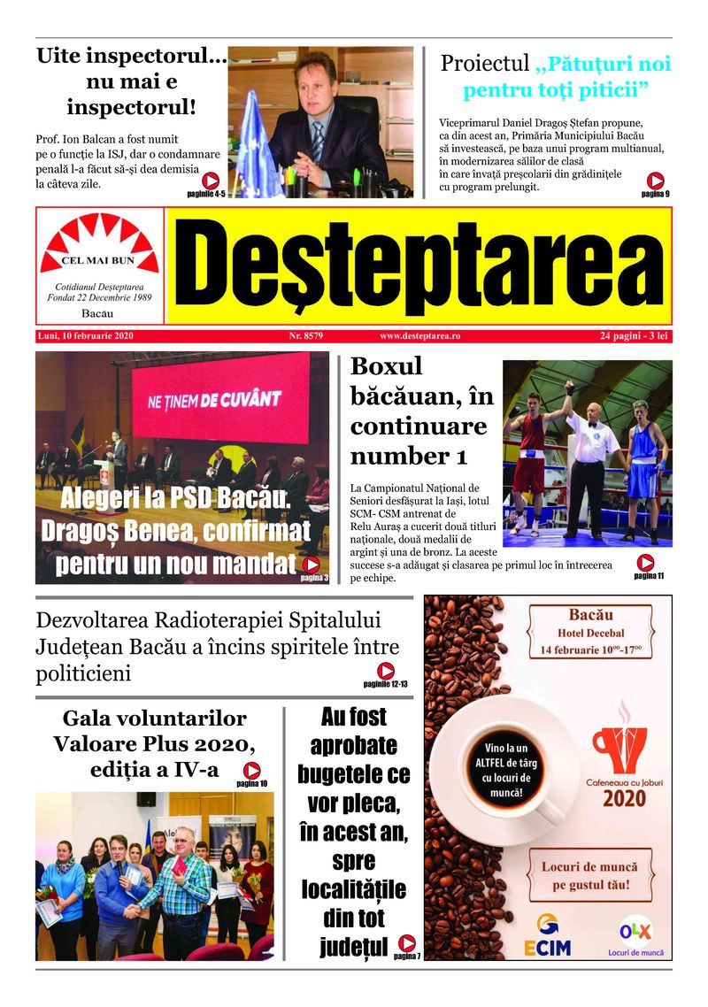 Coperta Deșteptarea10 februarie 2020AcțiuneFacebookTwitterWhatsAppTelegramVK AcțiuneFacebookTwitterWhatsAppTelegramVK Exercițiu de evacuare și prim ajutor la Spitalul Județean de Urgență Bacău, simulând un cutremur în zona VranceaSpitalul „Prof. Dr. Eduard Apetrei” Buhuși deschide dialogul cu pacienții, într-o întâlnire programată pe 23 decembrieDouă dintre cele mai valoroase companii din România sunt din Bacău, conform Ziarului FinanciarBacău: Universitatea „Vasile Alecsandri” a organizat serbarea de CrăciunDublă lansare de carte la Centrul de Cultură „George Apostu”, cu Carmen Mihalache și Dan PerșaCreștere a infecțiilor respiratorii în județul Bacău. Opt cazuri noi de gripă în ultima săptămânăPesta porcină africană confirmată la IteștiPompierii au verificat adăposturile antiaeriene. Doar 6% din populația județului încape în eleBurnout-ul de sărbători. De ce nu ne simțim mai bine după vacanță, ci mai obosiți„Genealogii imaginare”. Expoziție de sculptură Marian PetreIntervenție chirurgicală minim invazivă de excepție, realizată la Secția de Chirurgie și Ortopedie Pediatrică a SJU BacăuFotbal/ Liga 3: Etapă de final de an
