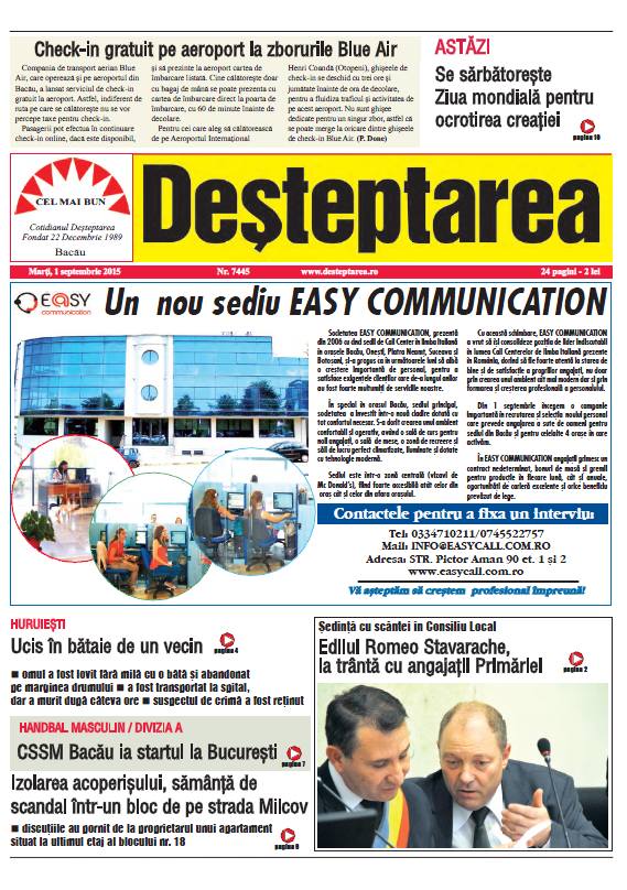 Coperta Deșteptarea 31 august 2015 Acțiune FacebookTwitterWhatsAppTelegramVK Acțiune FacebookTwitterWhatsAppTelegramVK Scheletul din dulapul Uniunii Europene Tânăr de 21 de ani, reținut după ce a condus fără permis și a folosit plăcuțe de înmatriculare false Hramul Sfintei Varvara și sinaxa preoților din Protopopiatul Onești, celebrate la 240 de metri adâncime în Salina Târgu Ocna Șezătoarea de la Măgura, o punte între generații și tradiții Percheziții și 12 autovehicule puse sub sechestru într-un dosar de evaziune fiscală de 150.000 de lei Jandarmii băcăuani au oferit daruri de Moș Nicolae unor copii din Stănișesti Gala Ecosistemului Antreprenorial al Universității «Vasile Alecsandri» Un mister din 1973… în Steagul roșu Fotbalul băcăuan la 360 de grade Depopularea continuă dar septembrie aduce o surpriză demografică Cum să ai grijă corect de parfumul tău Handbal juvenil: Prima ediție a Memorialului „Marcel Păunică”