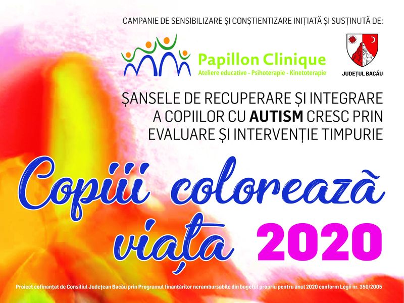 Asociația Papillon Clinique derulează în perioada 12 august – 13 noiembrie 2020, la nivelul Județului Bacău proiectul “Copiii colorează viața 2020”.  Proiectul este realizat cu sprijinul Consiliului Judeţean Bacău.Valoarea totală a proiectului este de 38.888,89 lei, iar Autoritatea Contractantă se angajează să acorde o finanțare nerambursabilă de maximum 35.000 lei, echivalentă cu 90% din valoarea totală eligibilă a Proiectului.