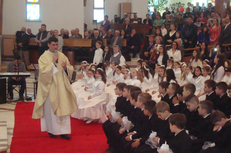 Duminica, 26 aprilie, de la ora 10.00, in Biserica Romano-Catolica „Sfintii Petru si Paul” din Bacau, 66 de copii imbracati in haine de sarbatoare, insotiti de parinti si de nasii de botez, l-au primit pentru prima oara pe Isus in Sfânta Impartasanie.