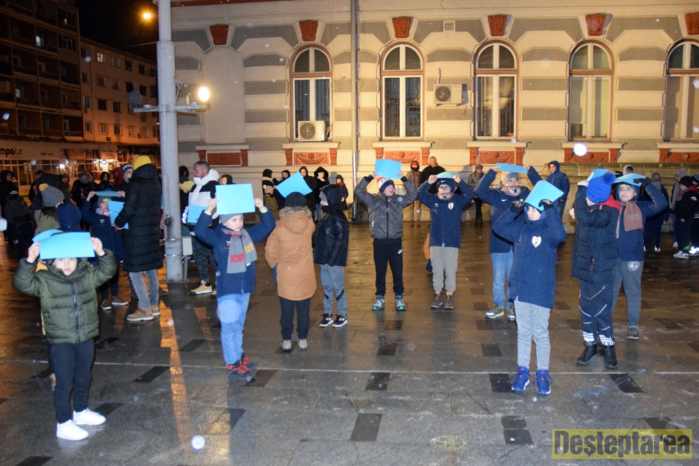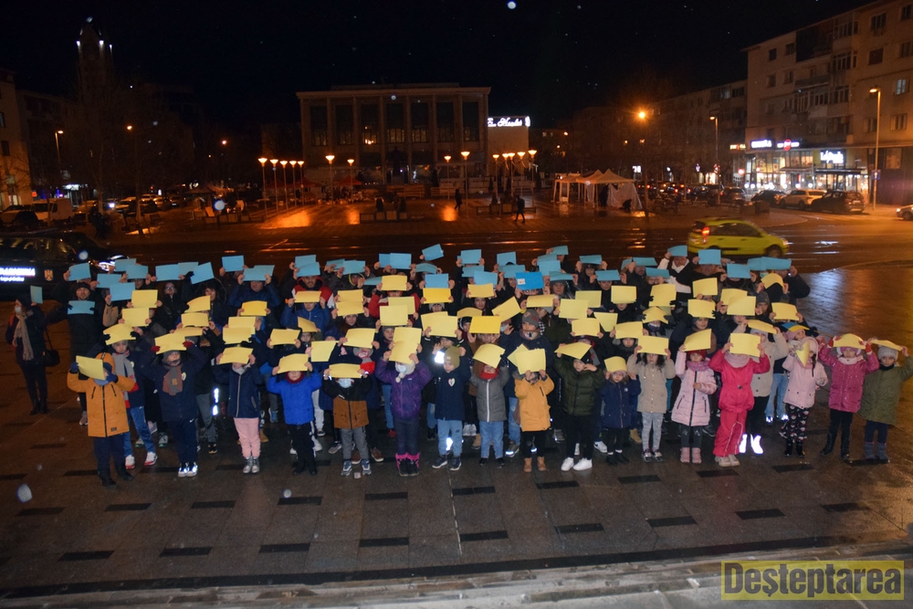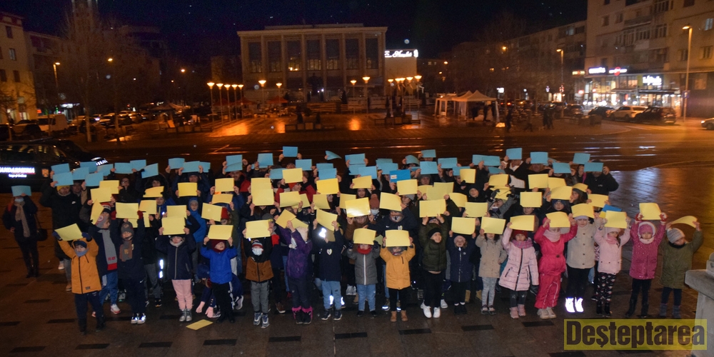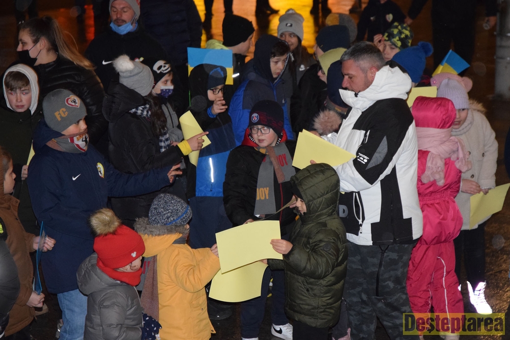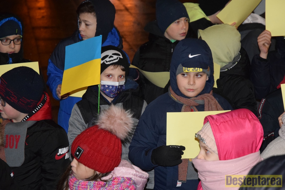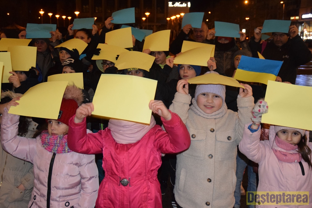Marți seara, la ora 19.30, în centrul orașului, copiii de la mai multe cluburi sportive din Bacău, însoțiți de părinți, s-au manifestat în tăcere. Au înălțat mâinile spre cer, ținând cartoane în culorile drapelului Ucrainei, albastru și galben. Un gest de solidaritate și un moment de reculegere pentru semenii lor, uciși de bombardamentele rusești în țara vecină. Au dorit ca vocile lor să fie auzite. Au rostit un „NU!” clar, războiului.