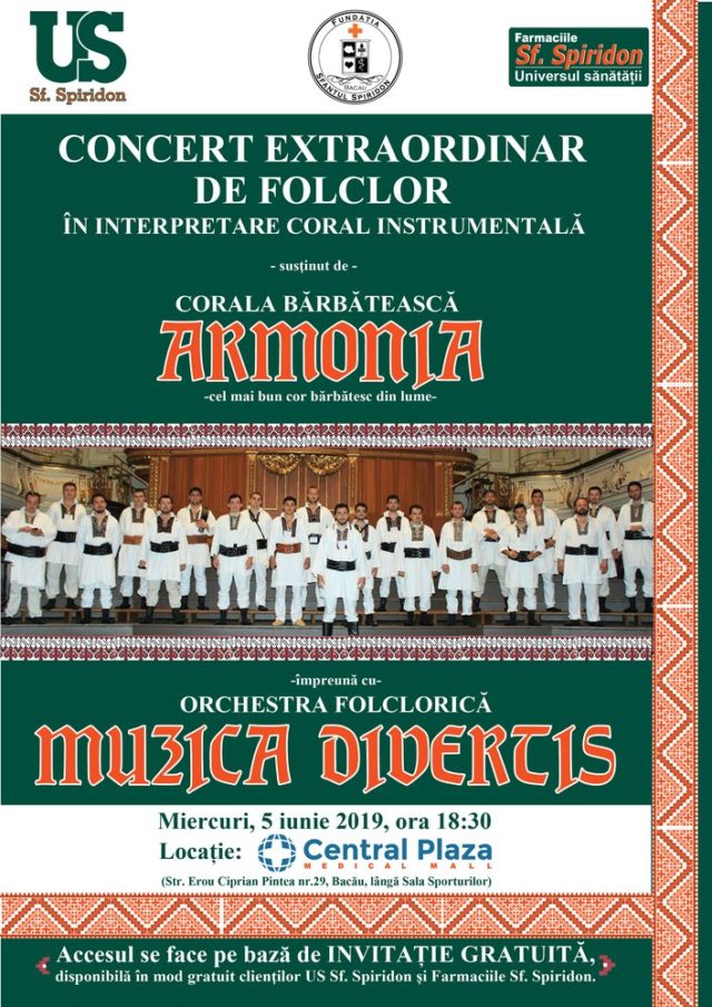 „Prezența în Bacău, a prestigioasei Corale Armonia din Constanța, în cadrul Concertului Extraordinar de Folclor din 5 iunie 2019, este surpriza pregătită de US și Farmaciile Sf. Spiridon, la începutul acestei veri, pentru pacienții noștri și familiile acestora. Concertul va avea loc în sala mare de conferințe a Central Plaza Medical Mall, care poate găzdui peste 1.000 de spectatori.