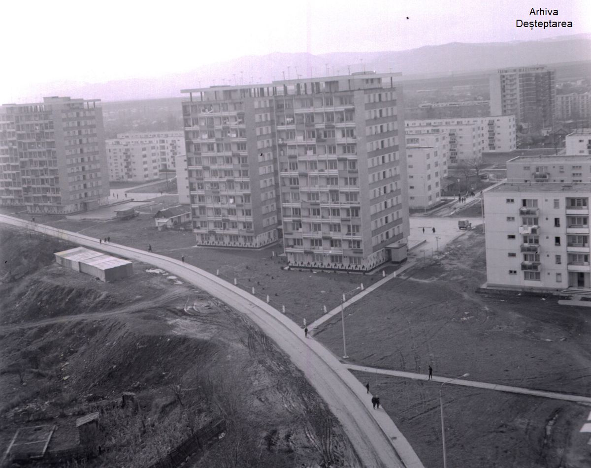 Drumul proaspăt asfaltat, care șerpuiește prin fața clădirilor, pare aproape pustiu, cu doar câțiva trecători – semn că locuințele erau, poate, abia repartizate noilor chiriași. Curțile dintre blocuri sunt încă golașe, iar trotuarele din beton par trase direct pe noroiul bătătorit de roțile utilajelor. În colțul din stânga jos se văd barăci provizorii, probabil rămase de la șantier, și o zonă cu teren accidentat, martor al reliefului modificat pentru a face loc blocurilor.