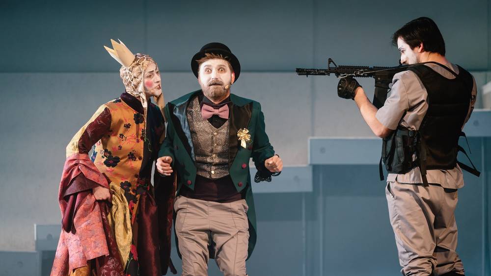 Sunt în spectacol imagini de o mare plasticitate, superbe, care-ți rămân în memorie, unele amintind de niște rafinate stampe japoneze, light designul lui Cristi Baciu decupându-le minunat, pentru a le potența expresivitatea. Vizual, cromatic, acustic, spectacolul pune în mișcare bogate sinestezii, iar costumele sunt de-o imaginație nebună, absolut delicioasă! Atât cele sugerând o dictatură militară de tip asiatic, cât și cele extravagante, ale personajelor Leonce, Regele, Valerio.