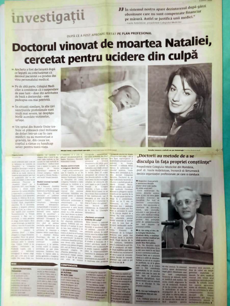 Pe 4 decembrie 2007 a apărut ancheta Un vis ucis în maternitate. Colegul mi-a povestit cum s-a ajuns la nașterea prematură la 26 de săptămâni, dar și imediat după. „Natalia m-a întrebat ce face copilul și i-am spus că este stabil, așa cum aflasem deja. Îi umezeam buzele cu un tampon, în vreme ce o asistentă mă tot soma să ies din salon. N-am să uit niciodată cum cerea apă, iar doctorița D. i-a strigat: «Taci din gura, că te dau afară!»”.