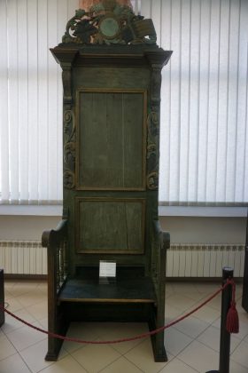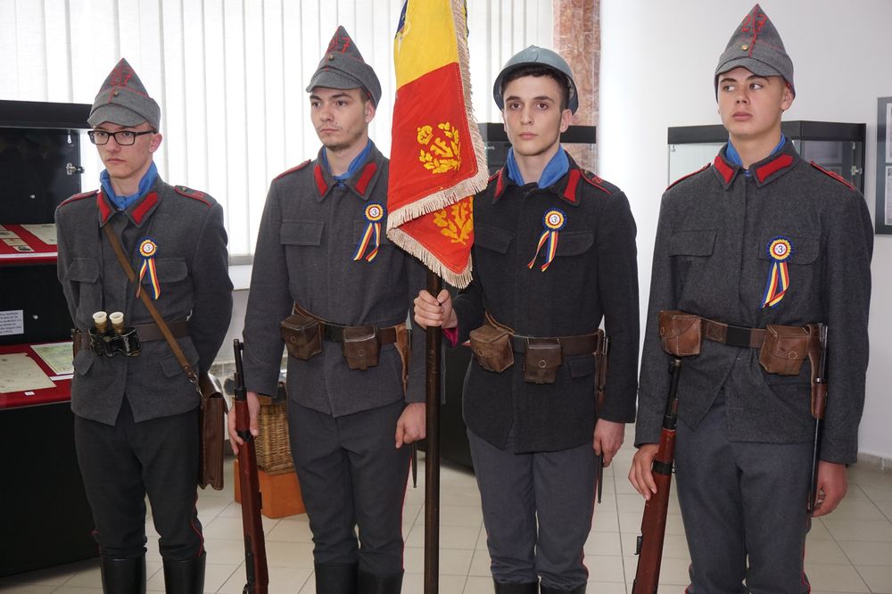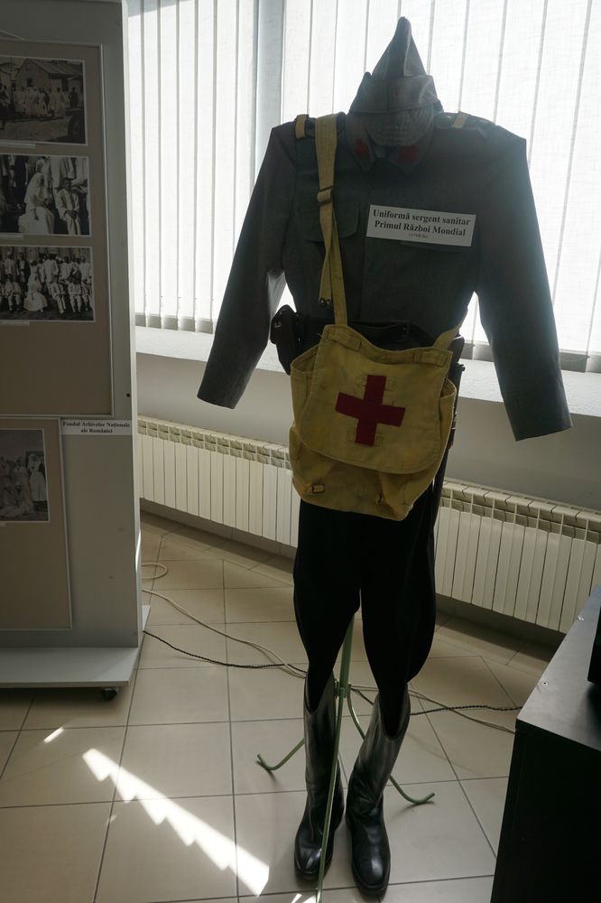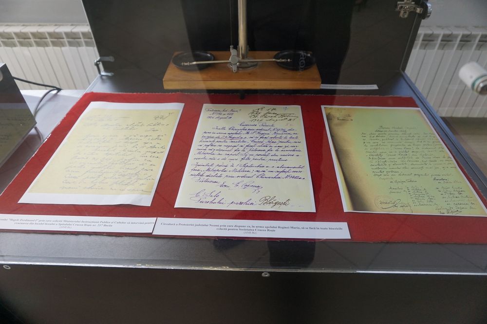Exponatele sunt interesante şi valoroase, piesa de rezistenţă fiind tronul Reginei Maria de la Mănăstirea Caşin, alături de care sunt prezentate documente, insigne, plachete, exponate ale Crucii Roşii Române, documente (brevete, registre, adeverinţe, certificate) ale Arhivelor Naţionale Bacău, fotografii ale Reginei Maria de pe front (Arhivele Naţionale Bucureşti), colecţii personale: prof. Aurel Stanciu (insigne), Ioan Catană (plicuri, timbre), col.(r) Stelian Cojocaru de la Asociaţia de Tradiţii Militare Româneşti, documente din Biblioteca Complexului Muzeal „Iulian Antonescu” Bacău, documente, drapele, stindard, insigne, medalii, plachete ale Muzeului Militar Bacău şi obiecte sanitare ale Şcolii Postliceale „Sanity”.