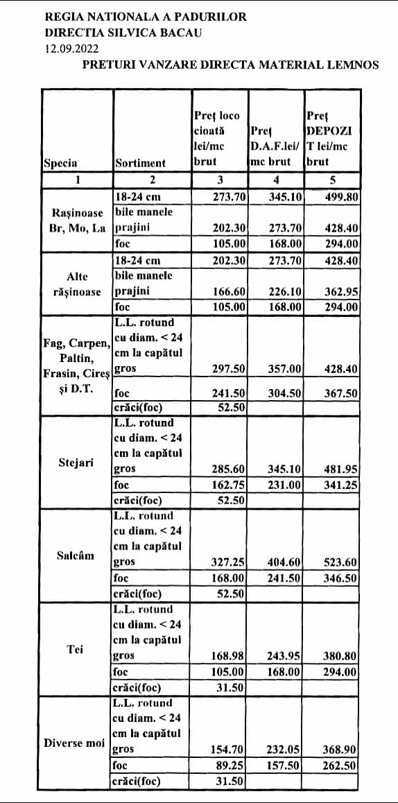 Regăsiți în imaginile alăturate lista ocoalelor silvice (cu datele de contact ale acestora), precum și politica de prețuri la vânzarea directă a materialului lemnos, practicată de Direcția Silvică Bacău (prețurile includ TVA).