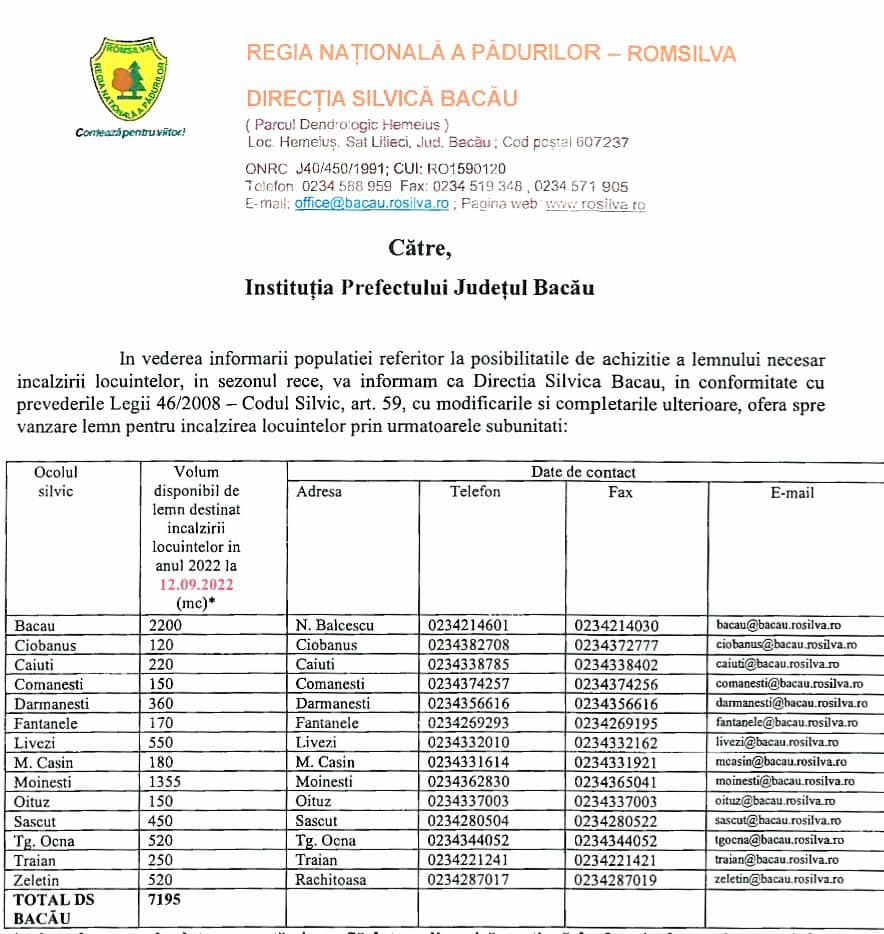 „Încălzirea locuințelor în timpul sezonului rece 2022/2023 este un obiectiv prioritar pentru noi, mai ales în contextul complicat pe care îl traversăm: alături de conducerea Direcției Silvice Bacău, am pus la punct un plan de scoatere la vânzare a lemnului destinat încălzirii locuințelor, prin intermediul celor 14 ocoale silvice teritoriale”, a declarat prefectul județului Bacău, Lucian Bogdănel.