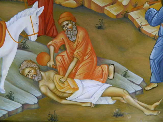 O pericopă de 12 versete (Luca 10, 25-37) marchează ultima Duminică dinaintea celor 40 de zile ale Postului Nașterii. Iar două interogații se fac prag de înțelegere a tainelor Împărăției Cerurilor. Prima, „Învățătorule, ce să fac ca să moștenesc viața de veci?”, adresată ispititor de un personaj important în ierarhia valorilor vremii și în interpretarea Scripturii, un nevârstnic învățător de lege. Dar și un răspuns – interogație al Domnului: „Ce este scris în Lege, cum citești?”. De fapt, acest „cum citești?” poate fi înțeles drept întrebarea din întrebare. Pentru că demască! Și titlul de învățător de lege (tânărul combinând cu ușurință și pe loc texte din cărțile Levitic, Deuteronom și Iosua, ca de pildă: „Să iubeşti pe Domnul Dumnezeul tău din toată inima ta, din tot sufletul tău, din toată puterea ta și din tot cugetul tău. Iar pe aproapele tău ca pe tine însuţi”) și viclenia, dar și faptul că ușor poți cădea în propria-ți cursă, atunci când începi a te considera superior. Magistrală este pedagogia Domnului! Nu merge la adânc, până ce nu descoperă. Abia după, replică: „Drept ai răspuns; fă aceasta și vei fi viu!”. Ca și cum i-ar fi zis: Fă ceea ce știi că trebuie făcut! Nu provoca! Nu răstălmăci învățătura! Nu o aplica formal în viața ta! … Tânărul ispititor continuă, prefăcându-se a nu ști ceea ce se poate înțelege prin termenul aproapele. Drept răspuns, Domnul potrivește o pildă, spre a mijloci înțelegerea conținutului: „Un om cobora de la Ierusalim la Ierihon şi a căzut între tâlhari, care, după ce l-au dezbrăcat şi l-au rănit, au plecat lăsându-l aproape mort. Din întâmplare, un preot cobora pe calea aceea şi, văzându-l, a trecut pe alături. Tot așa şi un levit.. Dar un samarinean, văzându-l, i s-a făcut milă. Apropiindu-se, i-a legat rănile, turnând pe ele untdelemn şi vin, şi, punându-l pe asinul său, l-a dus la o casă de oaspeţi şi a purtat grijă de el. Iar a doua zi, scoţând doi dinari, i-a dat gazdei şi i-a zis: Ai grijă de el şi, ce vei mai cheltui, eu, când mă voi întoarce, îţi voi da. Care dintre aceştia trei ţi se pare că a fost aproapele celui căzut între tâlhari? Tânărul rosti: Cel care a făcut milă cu el. Iisus încheie: Mergi şi fă şi tu asemenea!” (25-37)