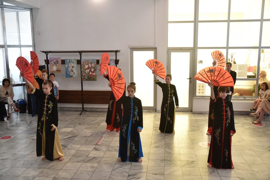 A urmat un frumos moment artistic și sportiv de sorginte asiatică susţinut de copii de la Clubul Sportiv ,,Bao” din Bacău (prof. coordonator Iuliana Dobrin), din care n-au lipsit artele marțiale – stilul Qwan Ki Do (care cuprinde multiple tehnici de arme), antrenori Valerică Diumea, centura neagră 6 dang și Iuliana Dobrin, centura neagră 3 Dang. De asemenea, sportive ale clubului, îmbrăcate în frumoase kimonouri au prezentat cu grație, spre încântarea publicului, tradiționalul dans japonez cu evantaiul, un ritual menit să atragă bunăstarea, norocul și veselia. Duetul de violoncele a avut ulterior alte două momente muzicale, care au prefigurat intrarea în scenă a prof. antrenor Radu Petrică de la Palatul Copiilor Bacău (centura neagră la Bujinkan Ninjutsu şi centura neagră 2 Dang la Qwan-ki-do), alături de Răzvan Panaite şi Iosup Dumitru. Aceștia au executat demonstraţiile mult aşteptate de arte marţiale japoneze (ninjutsu) cu arme şi fără, iar acestea au putut fi văzute şi cercetate de către cei prezenţi, într-o frumoasă expunere improvizată.