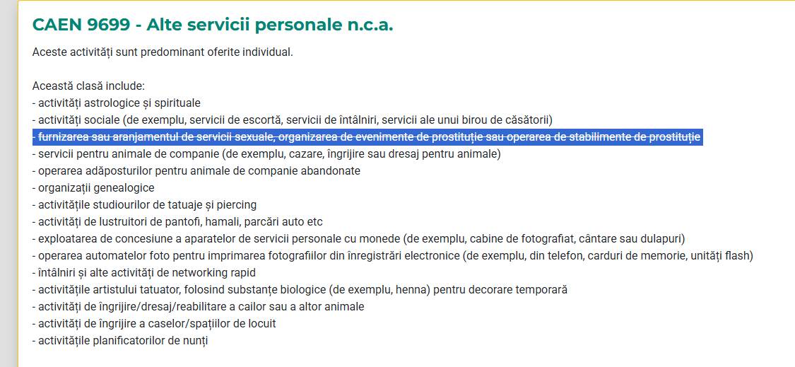 ONRC a confirmat faptul că prostituția apare în cadrul activităților descrise de noul cod CAEN, dar a subliniat că aceasta nu poate fi înregistrată ca obiect de activitate în registrul comerțului din România. Motivul este simplu: prostituția nu este legală în România. Practic, statul român a transpus legislația europeană în forma sa brută, fără a ajusta detaliile pentru a reflecta cadrul legal intern.