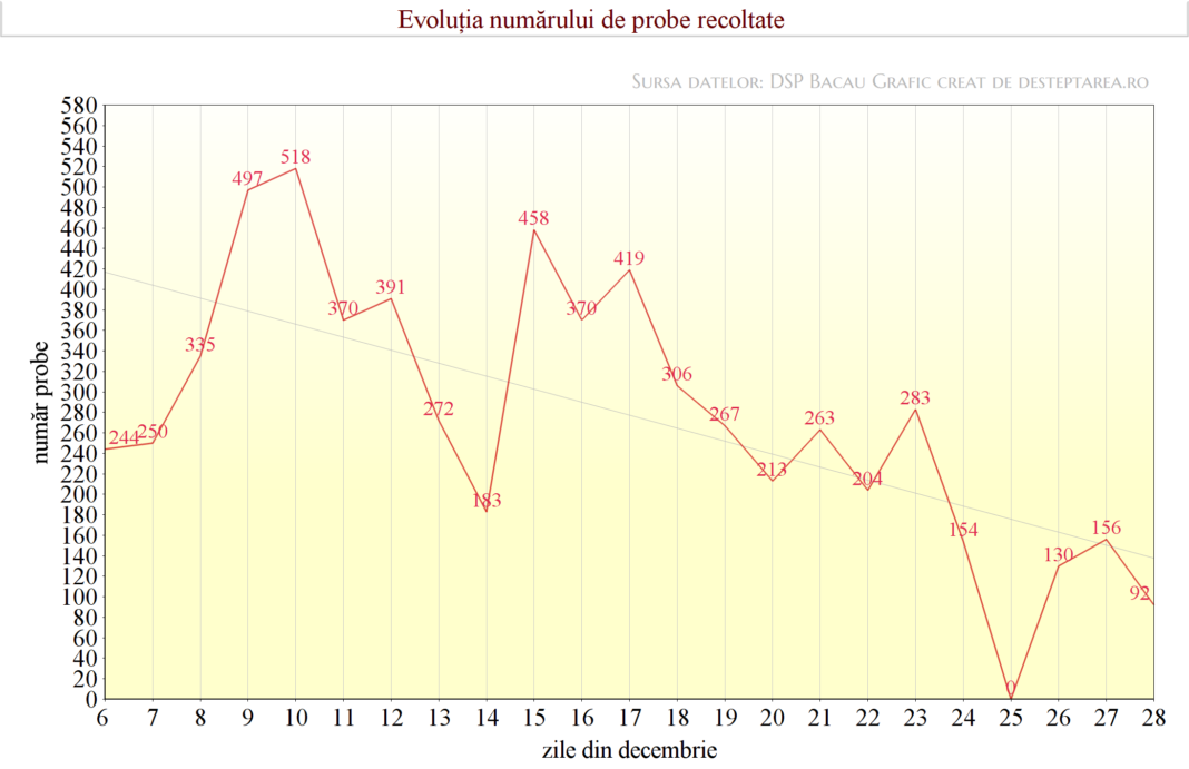 De la un număr maxim de 518 teste pe 10 decembrie, s-a ajuns la 154 pe 24 decembrie.
