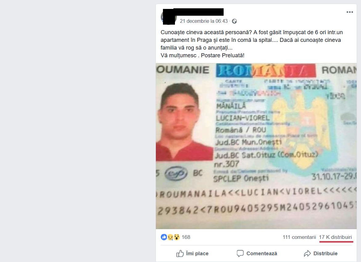 De câteva zile, lumea redistribuie postarea unuia care anunță că un tânar din județul Bacău a fost împușcat de șase ori și se află, în comă, la un spital din Praga. Băiatul roagă lumea să anunțe familia victimei și, pentru asta, atașează o copie după cartea de identitate a împușcatului.