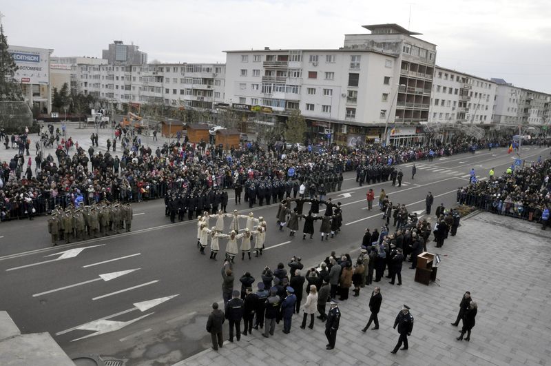 Ceremonialul religios a fost ascultat in liniste, au urmat interventiile autoritatilor, dansurile populare ale membrilor Ansamblului Plaiuri bacauane, invitatia la marea hora a Unirii care a fost destul de timida, urmata de defilarea Garzii de onoare pe acordurile Muzicii Militare a Garnizoanei Bacau.