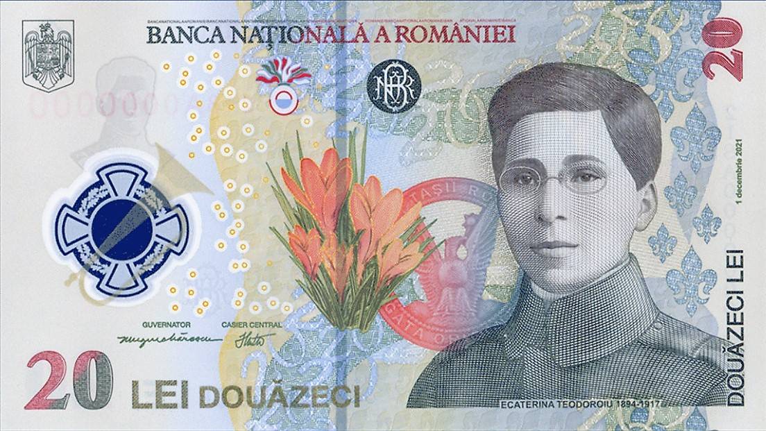 Bancnota de 20 de lei, ediția 2021 – a precizat guvernatorul -, este prima bancnotă românească de circulație care are imprimat chipul unui personaj feminin din țara noastră, al eroinei de la Jiu, Ecaterina Teodoroiu, căzută în luptă în 1917, la Mărășești. Se reia, astfel, o tradiție în istoria bancnotelor românești, în care unele dintre acestea aveau imprimate chipuri de femei.