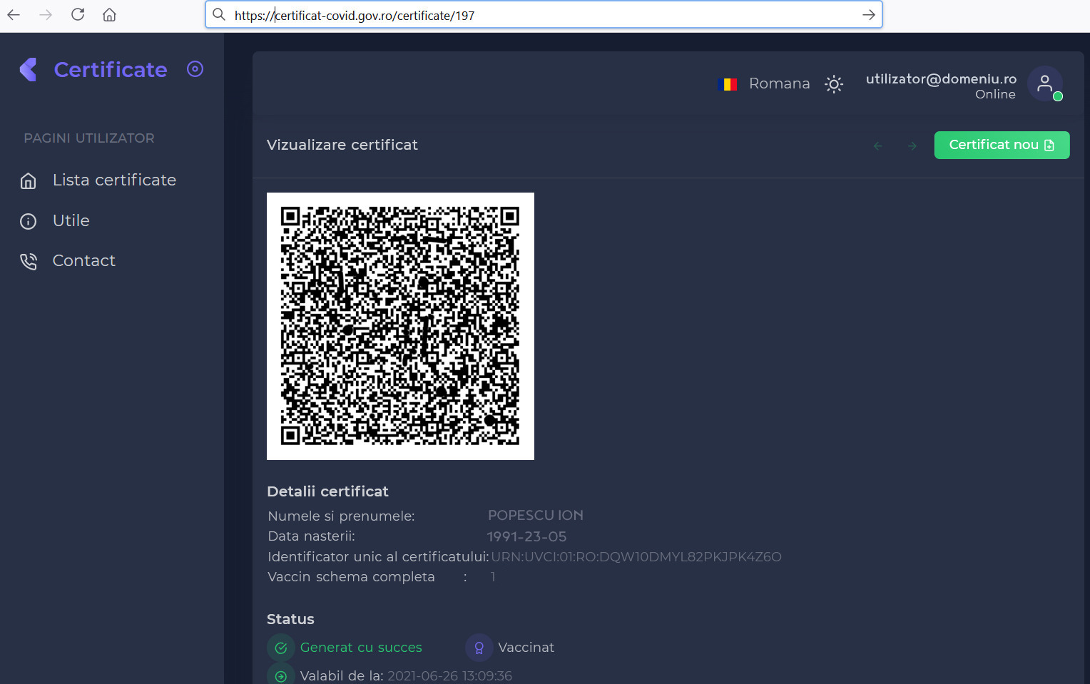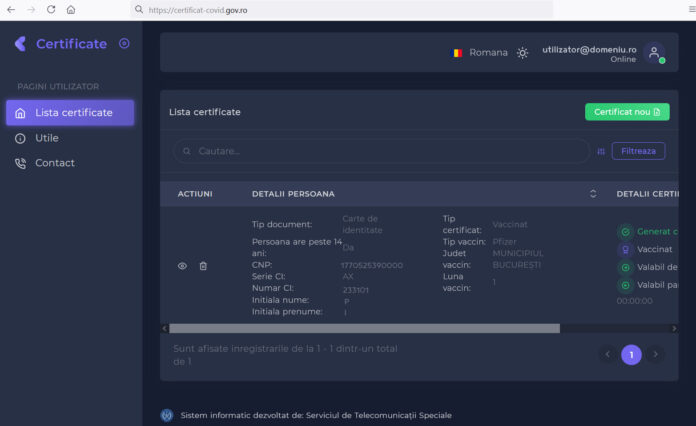 Cei care vor dori un certificat pentru a călători în siguranță pe timpul pandemiei de COVID-19 vor avea la dispoziție, începând de joi, platforma https://certificat-covid.gov.ro. Interfața aplicației este intuitivă, iar în mai puțin de 10 pași, poate fi obținut certificatul: