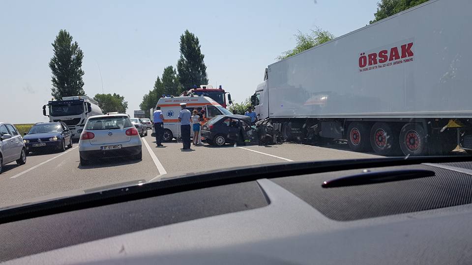 Poliţiştii spun că o şoferiţă de 19 ani, din judeţul Neamţ, în timp ce conducea un autoturism pe direcţia Roman-Bacău, pe fondul altor preocupări la volan a pierdut controlul asupra direcţiei de mers şi a intrat în coliziune cu un TIR, înmatriculat în Turcia, care era staţionat în afara părţii carosabile.