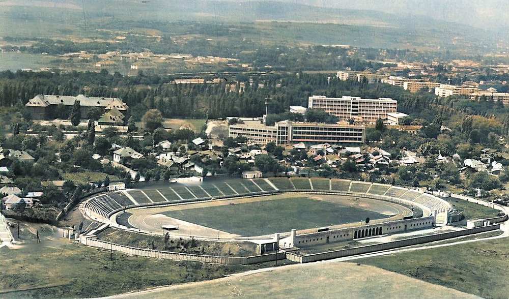 Prima imagine, o fotografie colorizată din anii ’60, ne arată un oraș Bacău mult mai simplu și liniștit. Stadionul este relativ modern pentru acea vreme, dar împrejurimile sale sunt dominate de case cu curți și terenuri deschise. În stânga sus, se poate observa clădirea veche a Liceului Pedagogic, o instituție marcată de tradiție în educația locală. În partea dreaptă, se remarcă clădirile spitalului, care la acel moment erau construite relativ recent, semnalând dezvoltarea infrastructurii de sănătate din acea perioadă.