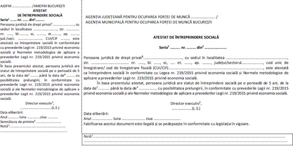 Atestarea întreprinderilor sociale și certificarea întreprinderilor sociale de inserție sunt gratuite și se realizează de către Agenția Națională pentru Ocuparea Forței de Muncă prin agențiile județene, respectiv Agenția Muncipală pentru Ocuparea Forței de Muncă București.