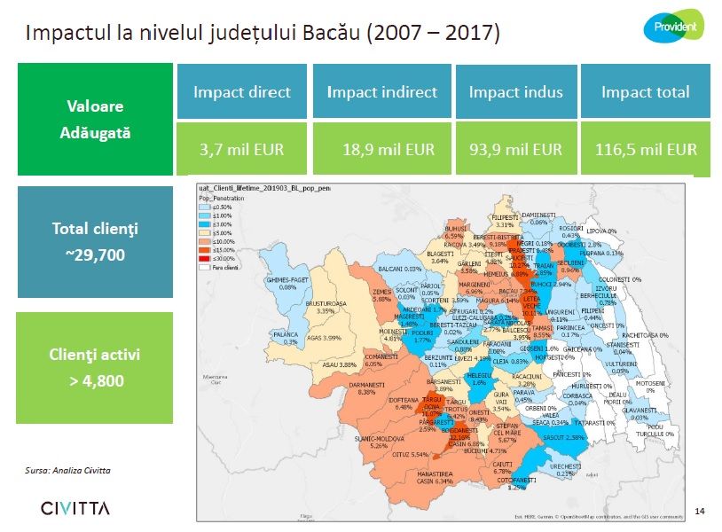 Mai mult decât atât, peste 116 de milioane de euro din impactul total calculat provin doar din judeţul Bacău. Impactul total al companiei reprezintă suma dintre valoarea adăugată, definită prin impactul direct, impactul indirect, tradus prin cheltuielile furnizorilor pe măsură ce aceştia rulează sumele încasate de la Provident, dar şi prin sumele acordate clienţilor, şi impactul indus, calculat prin efectul de multiplicare în economie.