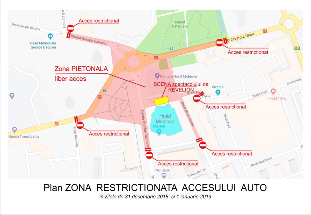 Pentru buna desfășurare a a evenimentului se vor închide următoarele străzi, în intervalul 31 decembrie, ora 20.00 -1 ianuarie, ora 6.00: Mihai Viteazu, tronsonul cuprins între intersecția cu Bulevardul Unirii și accesul din spatele Hotelului Moldova, Popa Șapcă, tronsonul cuprins între Vivariu și strada Mihai Viteazu, Nicolae Bălcescu, tronsonul cuprins între sensul giratoriu de pe strada 9 Mai și Statuia lui Ștefan cel Mare, George Bacovia, tronsonul cuprins între intersecția cu Banca Națională și statuia lui Ștefan cel Mare, Mihail Kogălniceanu, tronsonul cuprins între statuia lui Ștefancel Mare și intersecția cu străzile Oituz și Războieni