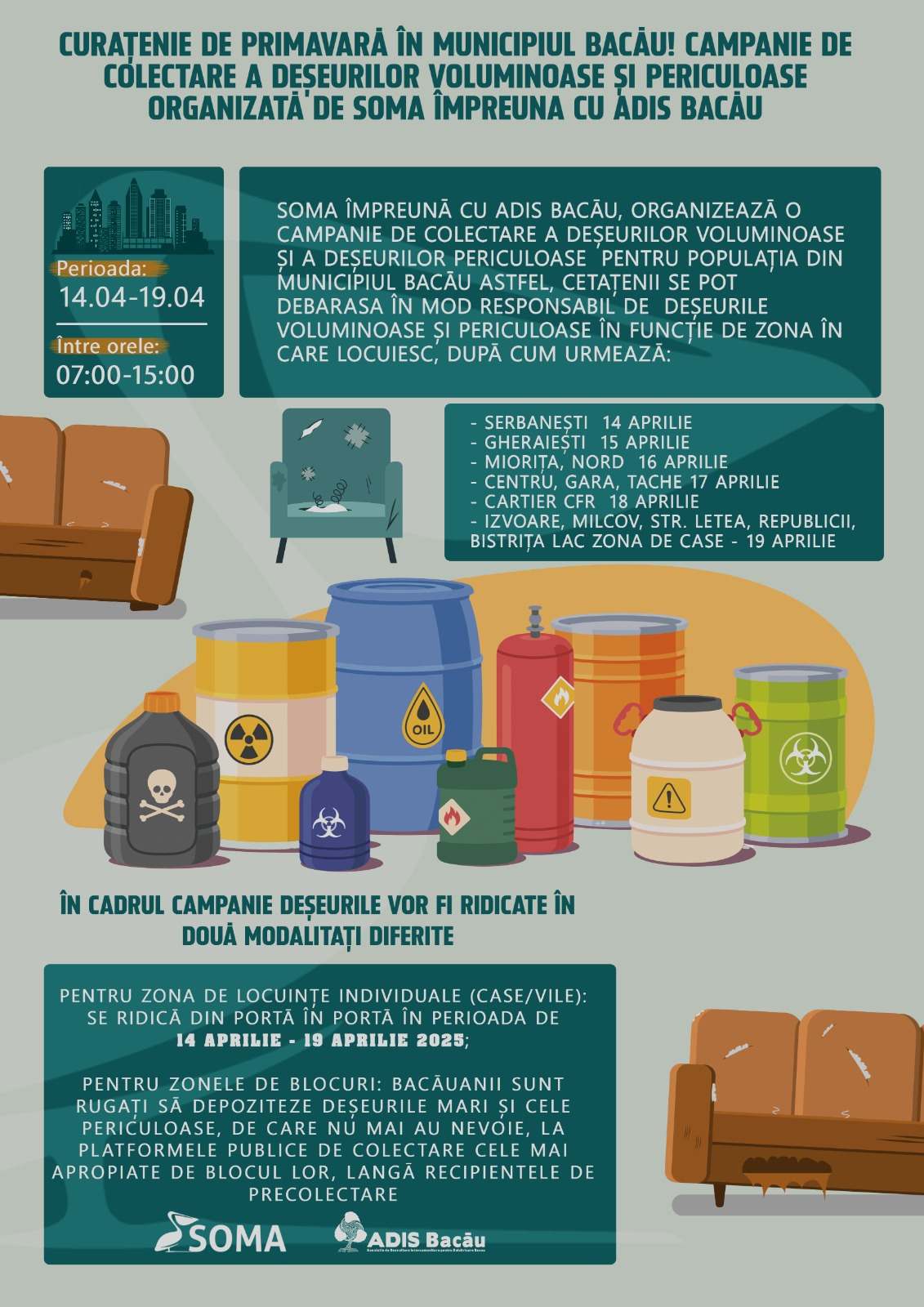În perioada 14-19 aprilie 2025, municipiul Bacău desfășoară o amplă campanie de colectare a deșeurilor voluminoase și periculoase, organizată de SOMA în parteneriat cu ADIS Bacău.