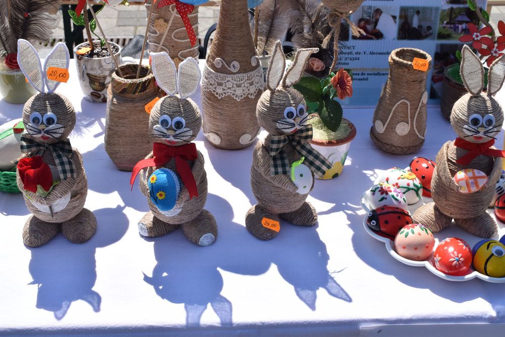 Așa am descoperit carul cu boi, roabele cu flori, pietrele pictate, oițele cu lână aurie, casetele din lemn pictate, în care poți ține orice, aranjamentele cu crengi de măr sau de iasomie galbenă. Și am uitat să vă spun că pe tarabe, printre iepurași și puișori, erau fel de fel de bunătățuri: cozonac cu nucă, plăcinte cu mere, poale-n brâu, negrese, rulade, turtă dulce, puișori, salată de fructe în aspic, ouă de ciocolată umplute cu cremă de brânză, borcănele cu miere, dulceață sau compot…