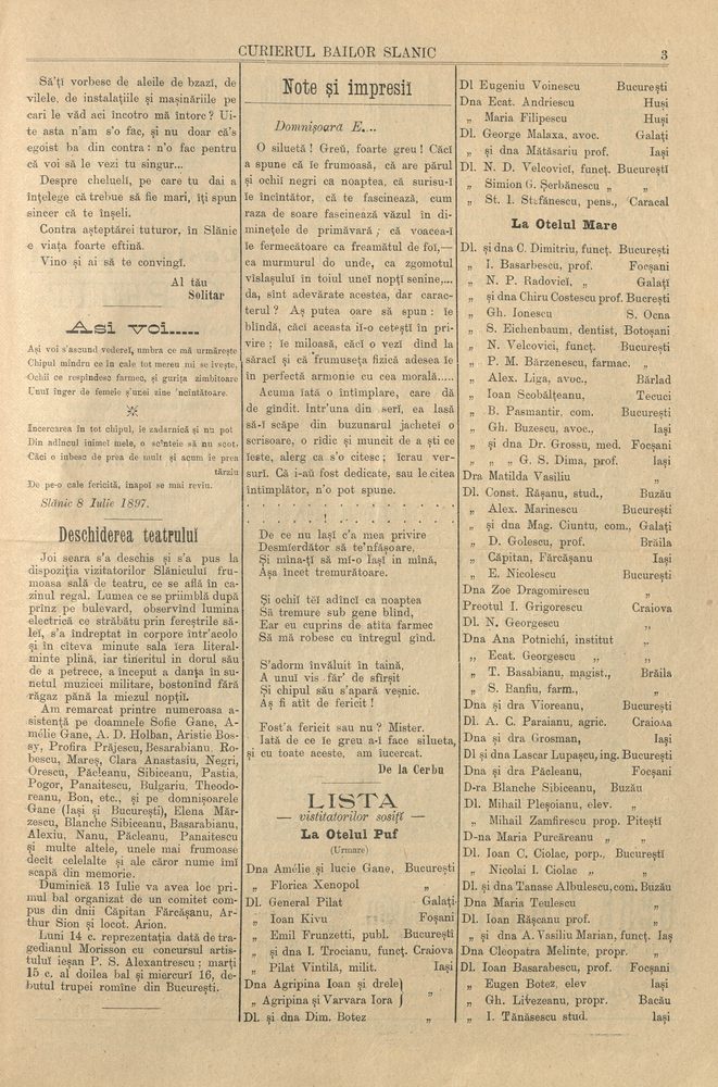 Mai putem citi în acest număr, note și impresii ale vizitatorilor, scrisori de recomandare a Băilor Slănic, dar principala știre a săptămânii este cea legată de momentul festiv al inaugurării frumoasei Săli de teatru (din incinta Cazinoului Regal), joi, 10 iulie 1897: ,,Lumea ce se plimbă după prânz pe bulevard, observând lumina electrică ce străbate prin fereștrile sălii, s-a îndreptat in corpore într-acolo și în câteva minute sala era literalmente plină, iar tineretul, în dorul său de a petrece, a început a dansa în sunetul muzicii militare, bostonând fără răgaz până la miezul nopții (de la boston, un dans lent, asemănător valsului, n. a.)”. În această sală au fost organizate seri dansante, care aveau loc de trei ori pe săptămână, în alternanță cu spectacole de teatru susținute de nume mari ale scenei românești.