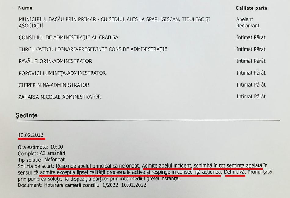 „Hotărârea pronunțată, joi, de Curtea de Apel Bacău reașază în matca legalității un demers discreționar al conducerii UAT Municipiul Bacău care, speculând calitatea de acționar majoritar al CRAB, a urmărit revocarea consiliului de administrație al operatorului, în temeiul unei inițiative abuzive pornite anul trecut.