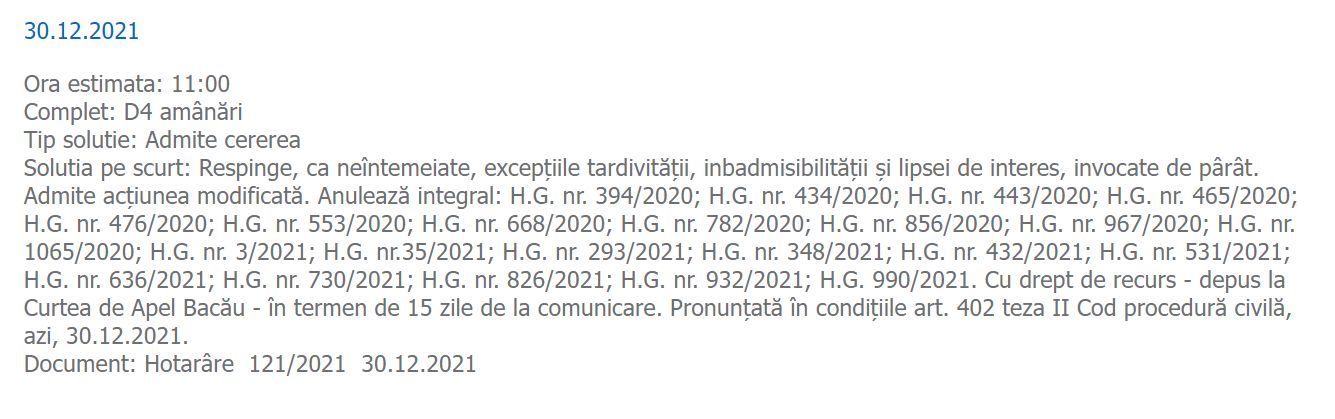 În ședința de ieri, 30 decembrie, Curtea de Apel Bacău a anulat nu mai puțin de 22 de hotărâri de Guvern referitoare la starea de alertă, prelungirea acesteia și restricțiile impuse.
