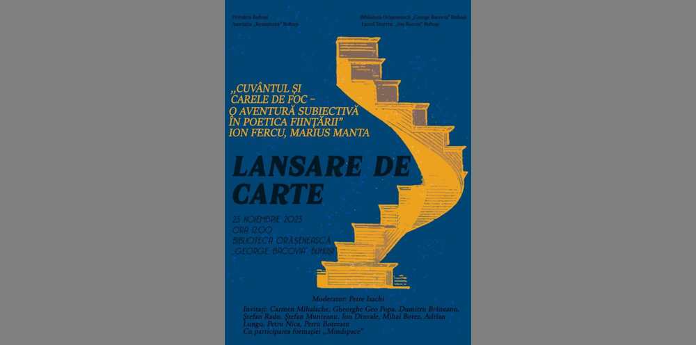 Volumul „Cuvântul şi carele de foc – o aventură subiectivă în poetica fiinţării” va fi lansat oficial joi, 23 noiembrie, ora 12.00, la Biblioteca orăşenească „George Bacovia” Buhuşi. Sunt invitaţi să prezinte cartea critici literari, de teatru, romancieri, poeţi, filozofi, editori, ziarişti: Carmen Mihalache, Gheorghe Geo Popa, Dumitru Brăneanu, Ştefan Radu, Ştefan Munteanu, Ion Dinvale, Mihai Botez, Adrian Lungu, Petru Nica, Petru Botezatu. Moderator: scriitorul şi criticul literar, Petre Isachi. Cu participarea formaţiei „Mindspace”.