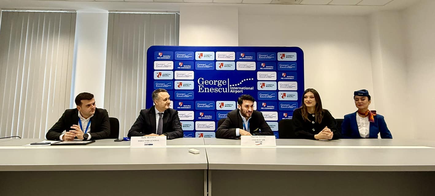 On the occasion of marking one year since Dan Air began operating from Bacău Airport, Matt Ian David, CEO of Dan Air, accompanied by other company representatives, joined Radu Bezniuc, General Manager of the „George Enescu” International Airport in Bacău, for a press conference held at the airport.