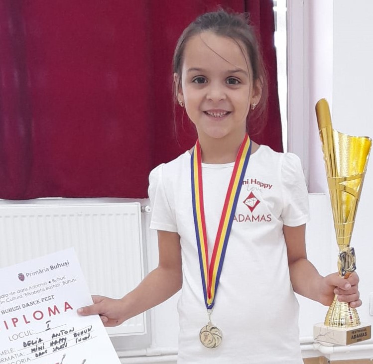 Avem în jurul nostru mulți copii. Copii buni și talentați. De această dată ne-am oprit la un grup de copii care au în comun, pe lângă multe altele, o frumoasă pasiune: dansul. Deși au vârste fragede, unii dintre ei cochetează cu această formă de mișcare de doi, trei, patru sau chiar cinci ani. Acum formează un grup strâns și împreună muncesc la fiecare oră de antrenament cu dorința să fie din ce în ce mai buni. Firește, sunt copii și se mai și joacă. Dar, avem noi în popor o vorbă: Unde ai văzut copil cuminte și babă frumoasă? Evident că și copilăresc, dar când e vorba de treabă, nimeni nu se dă deoparte. Și au reușit în cei câțiva ani de când sunt împreună, sub numele de MiniHappy (pentru că a existat o formație mai mare care se numea Happy DanceSport – n.r.), formație din cadrul Școlii de Dans Adamas Buhuși, să adune numeroase rezultate importante. Un sac de medalii și zeci de trofee și-au trecut în cont cei de la MiniHappy, numai la ultima lor evoluție din urmă cu o săptămână reușind 6 locuri 1 din șase participări.