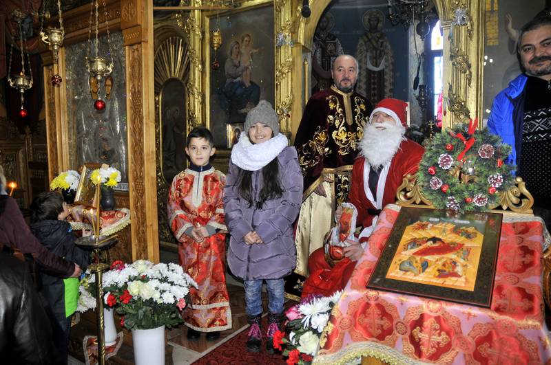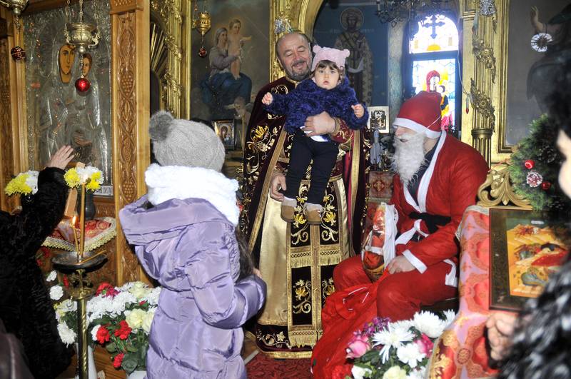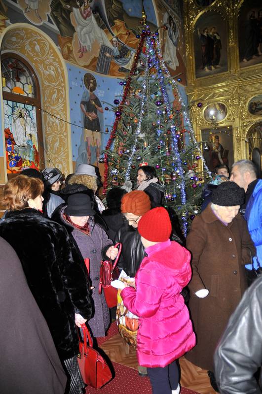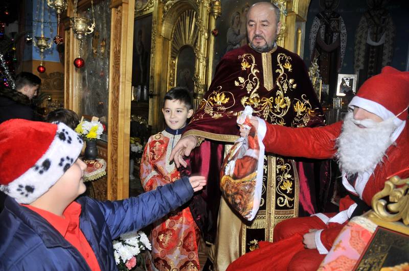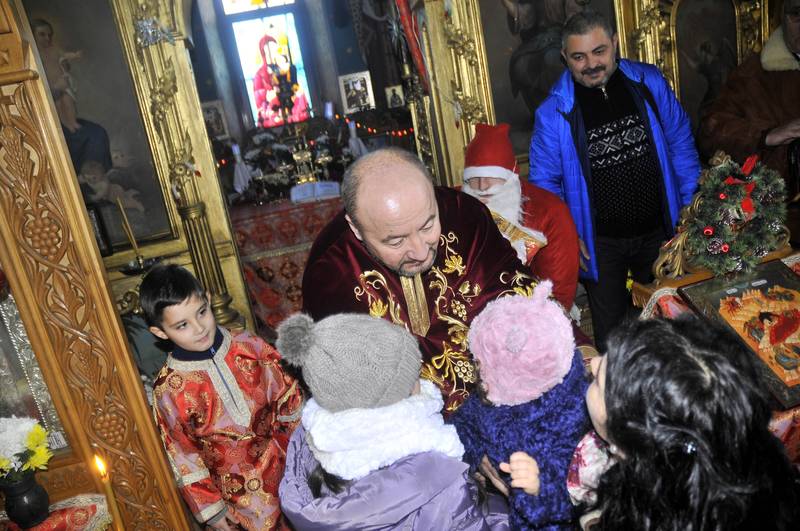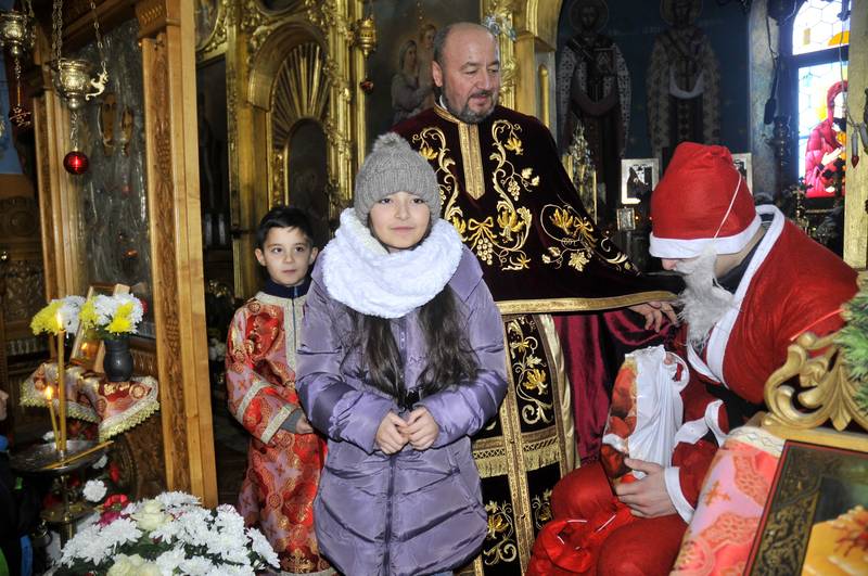Alaturi de darurile dumnezeiesti primite de credinciosi la Sfânta Liturghie a Nasterii Domnului, in Biserica „Sfânta Treime” din Cimitirul Central al municipiului Bacau a venit Mos Craciun cu daruri pentru cei mici si cei mari.